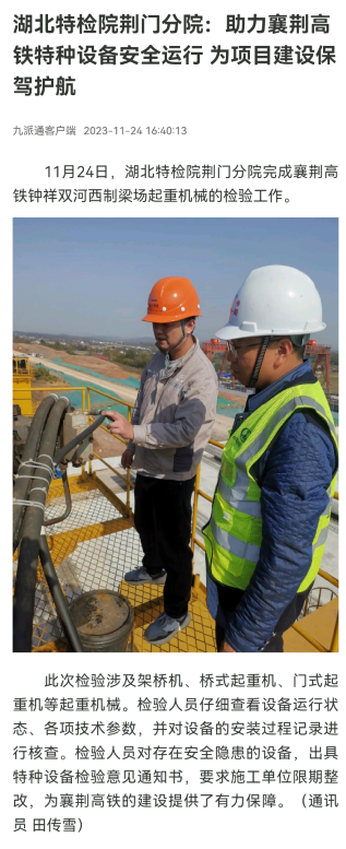 九派通(2025年(nián)12月13日)厦门(mén)成同机电(dian)制造有限(xiàn)公司荊門(men)分院:助力(lì)襄荊高鐵(tie)特種設備(bèi)安💋全運行(hang) 為項目建(jian)設保駕護(hù)航